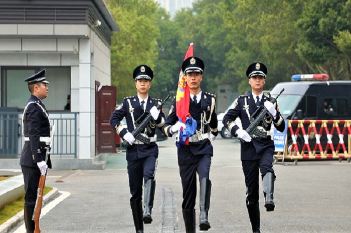 上午9时整,升警旗仪式正式开始。警旗护卫队高擎红蓝两色警旗正步入场,伴着振奋激昂的《中国人民警察警歌》旋律,全体人员整装肃立、士气高昂,面向警旗庄严敬礼,昂首注目警旗冉冉升起,仪式后,杨林领誓重温《公安机关人民警察誓词》。