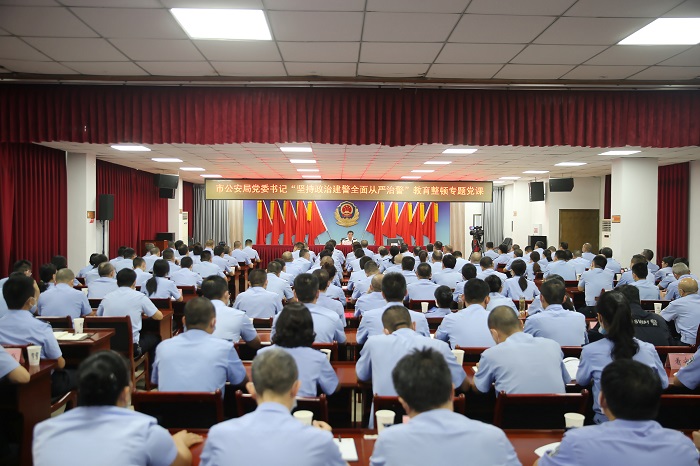 9月15日下午,市公安局召开党委书记“坚持政治建警全面从严治警”教育整顿专题党课。市局在家局领导、副科职以上领导干部和党员民辅警代表共计160余人参加此次会议。