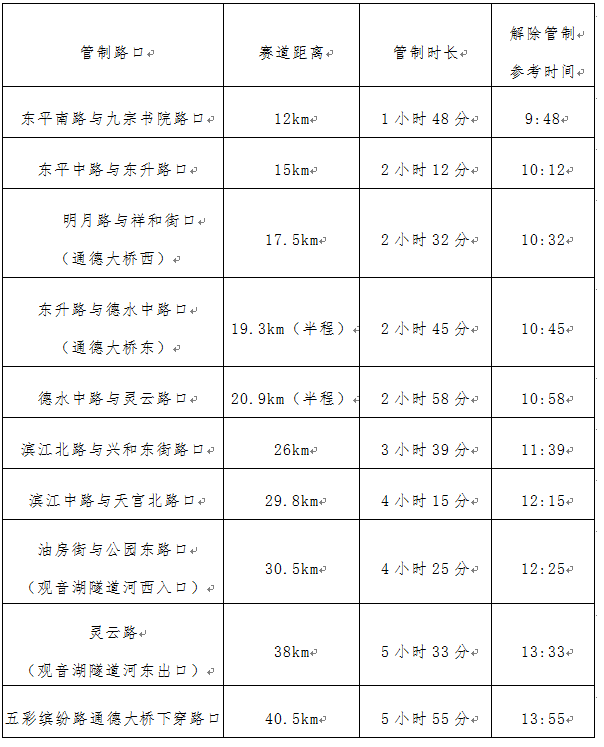 (三)10月20日7:30至14:00,从河东体育中心赛道起点开始,公安交管部门根据赛事进程沿比赛前进线路分段实施交通管制,禁止赛道沿途各路口、单位、小区、停车场出入口的行人及车辆进入赛道。各路段赛事通行完毕后,公安交管部门根据现场情况适时解除交通管制,相关主要路段交通恢复参考时间如下: