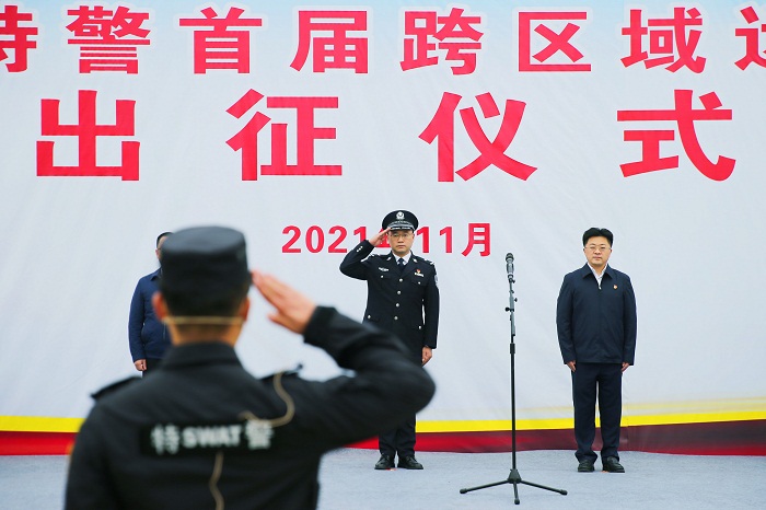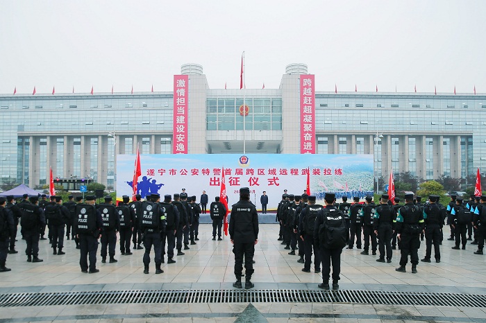 为积极探索全市公安特警跨区域增援和联动协同处置机制,检验全警实战大练兵工作成效。11月16日,遂宁市公安特警首届跨区域远程武装拉练出征仪式在安居举行。副市长、市公安局局长杨林出席仪式并发布出征命令,安居区委书记吴军出席仪式并致辞,安居区委副书记、区长杨文彬,安居区委常委、政法委书记杨敏,市公安局党委委员、副局长王俊锋出席仪式。