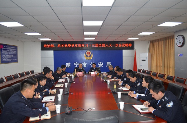 会议强调,一是强化理论武装、组织专题传达,迅速掀起学习热潮。要立即组织传达学习,党员领导干部要在学习中做示范者、传递者和实践者;把学习活动作为遵循、引向深入、推动工作;确保全面性、针对性和实效性,实现学习贯彻在遂宁公安事业点上生根、线上开花、面上出彩。二是强化政治站位、做到入脑入心,把握会议精神实质。要将学习两会精神与“两学一做”学习教育、习近平来川视察重要讲话精神和公安重点工作结合起来,准确把握核心要义和丰富内涵,坚定维护习近平总书记在党中央和全党的核心地位。三是强化履职尽责、坚持学思践悟,推动公安事业发展。要结合公安职能职责,贯彻落实新时代党的建设总要求,积极践行人民为中心的发展思想,强力推进扫黑除恶专项斗争,深入开展以法治市工作,不断凝聚遂宁公安前进动能。