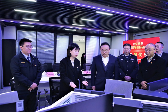 在揭牌仪式上,相关负责人通报了2022年打击涉烟犯罪成果,详细介绍了研判室硬软件建设、功能布局、模块运行、人员入驻模式等方面情况。
