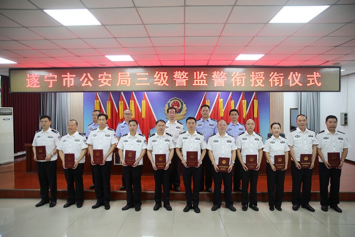 仪式上,徐承副市长发表讲话,对11名晋升三级警监警衔的民警表示热烈祝贺! 他指出,警衔是党和人民赋予公安民警的特殊荣誉。举行警监警衔授予仪式,是深入学习贯彻习近平总书记关于“完善人民警察荣誉制度”重要指示精神的重要举措,对于增强民警职业荣誉感、自豪感、归属感,激励广大民警更加珍惜荣誉、更好履行使命具有十分重要的意义。 他希望,一要心怀感恩,坚定不移守初心。要懂得感恩,感恩党,感恩组织,珍惜荣誉,始终不渝听党话、跟党走,坚持不懈地用党的创新理论特别是习近平新时代中国特色社会主义思想武装头脑,切实增强“四个意识”、坚定“四个自信”、做到“两个维护”,把党的绝对领导贯彻到公安工作和队伍建设各方面全过程,做到绝对忠诚、绝对纯洁、绝对可靠。二要主动作为,忠诚履职担使命。要戒骄戒躁,继续发挥模范引领的“头雁”作用,保持谦虚谨慎的工作作风,一言一行做表率,一岗一位担责任,主动适应新时代公安工作的发展和变化,争做遂宁公安事业发展的推动者、担当者、奋进者。三要永葆本色,持之以恒守正气。要始终对标“对党忠诚、服务人民、执法公正、纪律严明”总要求,坚持以身作则、以上率下,示范带动全警,做到知敬畏、存戒惧、守底线,清清白白做人、干干净净做事、坦坦荡荡为官,维护好遂宁公安的良好形象。