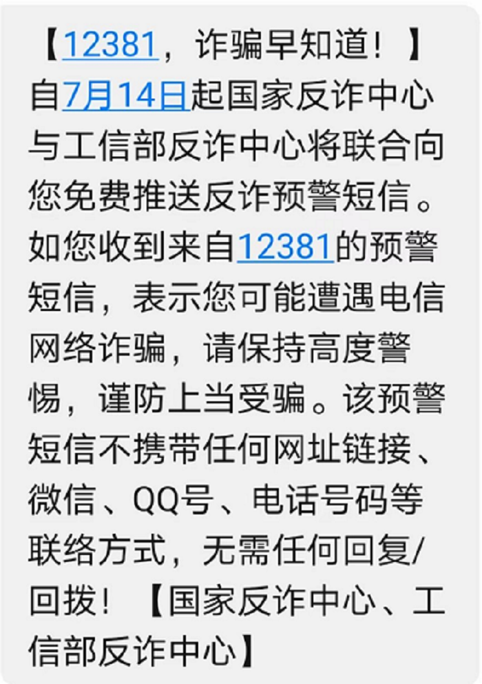 7月14日,工信部联合公安部在京举行12381涉诈预警劝阻短信系统启动仪式暨新闻发布会,正式启用12381涉诈预警劝阻短信系统,通报信息通信行业防范治理电信网络诈骗工作情况。