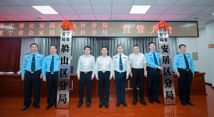 会议宣读了船山区、安居区公安分局直管文件和分局主要领导任职文件,并现场授牌授印。船山区、安居区公安分局局长分别作表态发言。