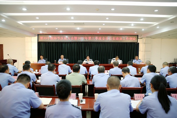 9月6日上午,市局召开第33个教师节庆祝大会暨2017年第三季度全市公安政治工作例会。会议的主题是:认真贯彻习近平总书记“四句话、十六字”总要求,全面落实第三季度全省公安政治工作例会精神,热烈庆祝第33个教师节,深化“两学一做”学习教育,为开展“迎接十九大、忠诚保平安”主题活动、确保“三个不发生”创建活动提供坚强的思想保证。副市长、市公安局党委书记、局长徐承出席会议并作重要讲话。会议由市公安局党委副书记、常务副局长银宏主持。