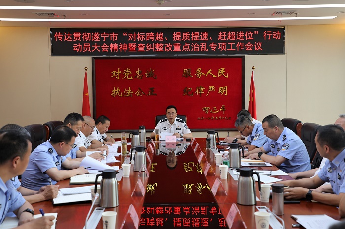 会议传达学习了遂宁市“对标跨越、提质提速、赶超进位”行动动员大会精神,对查纠整改重点治乱专项工作进行了研究部署。市局办公室通报了公安机关2023年承接省委省政府对市委市政府考核项目情况,各位局领导通报了分管领域承接项目考核工作情况,各县(市、区)公安(分)局局长及市局有关部门主要负责同志就涉及党政条线业务工作考核情况、存在问题及整改措施进行了汇报。