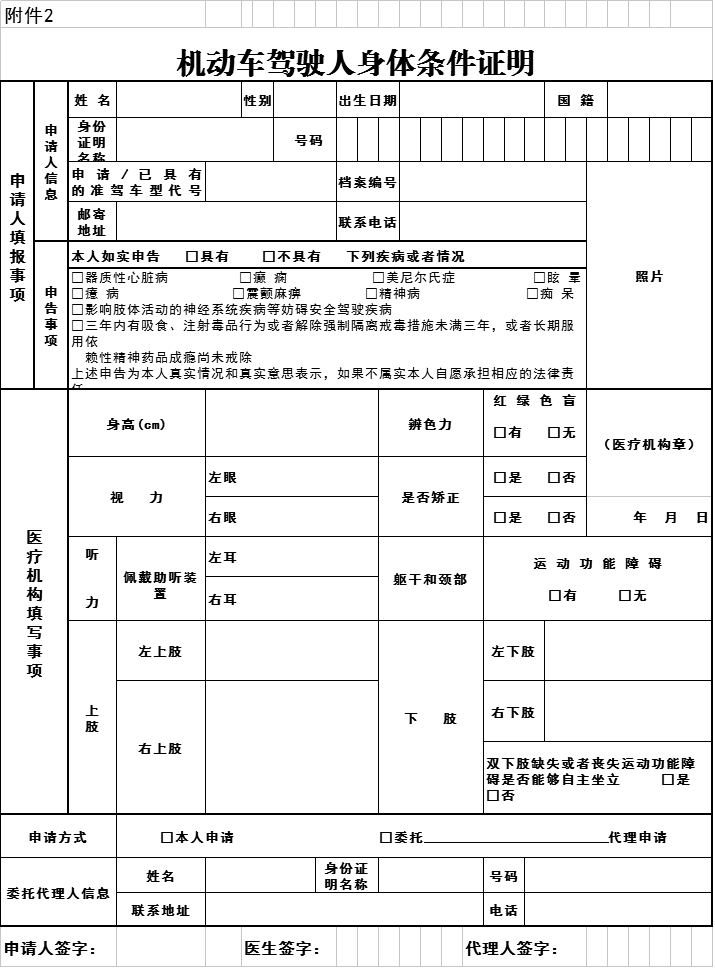 (四)县级或部队团级以上医疗机构出具的《机动车驾驶人身体条件证明》;