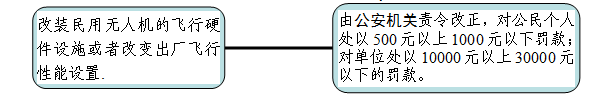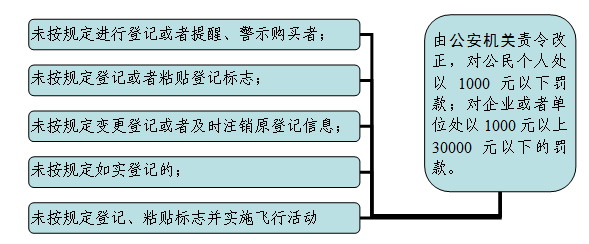 第五章:法律责任。规定了民用无人机所有者和操作人员的安全责任,规定违法违规信息纳入相关监督管理平台和企业信用信息系统。规定了民用无人机违反机场净空保护、实名登记、改装规定、无线电及治安管理等行为的法律责任。